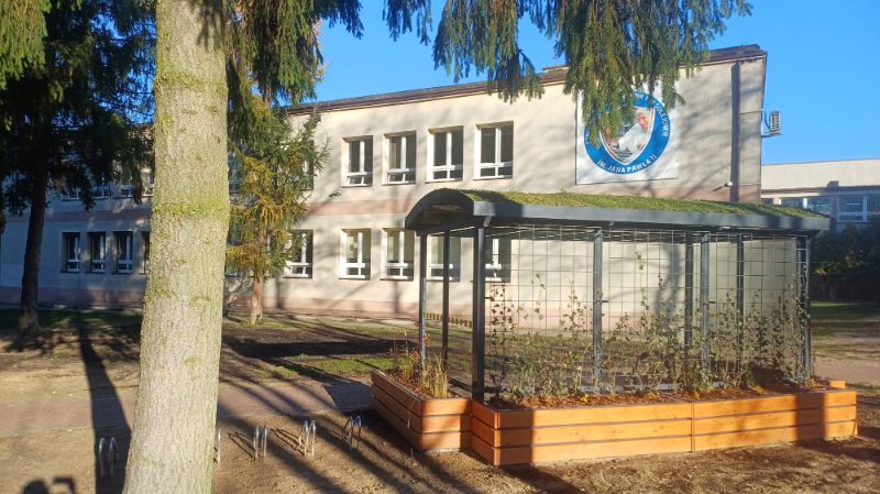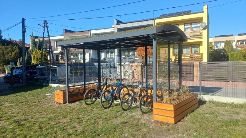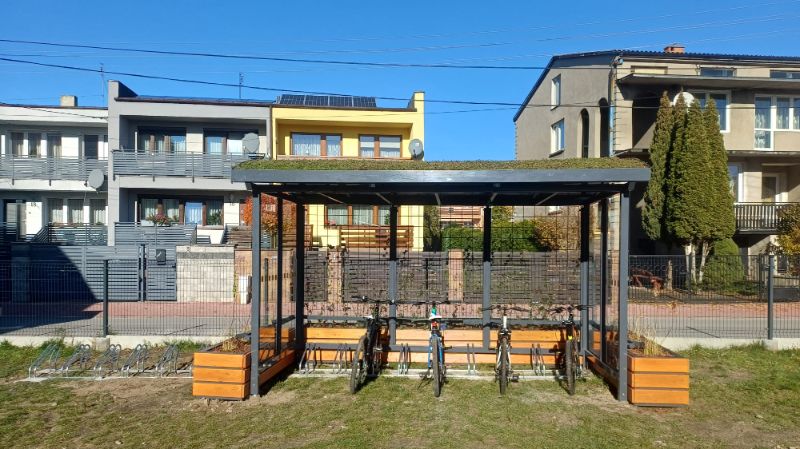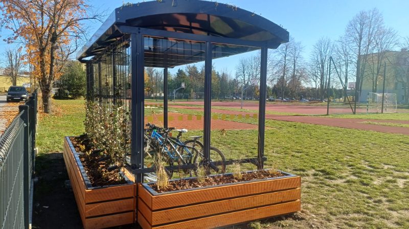 Opoczno (2025) 1 Zielona Wiata Rowerowa wyposażona w zielony dach, zieloną ścianę oraz stojaki na rowery. Wiata znajduje się przy szkole przy ul. Armii Krajowej.